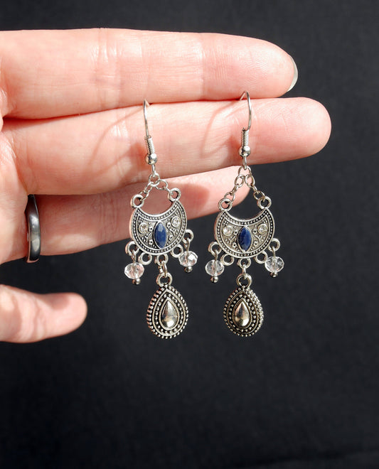 Silver and Blue Filigree Dangling Earrings (Ear Hook, Stud or Clip On)
