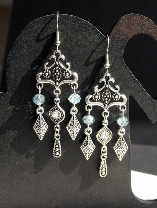 Long Silver and Light Blue Gypsy Statement Earrings (Ear Hook, Stud and Clip On)