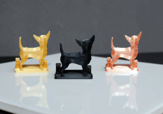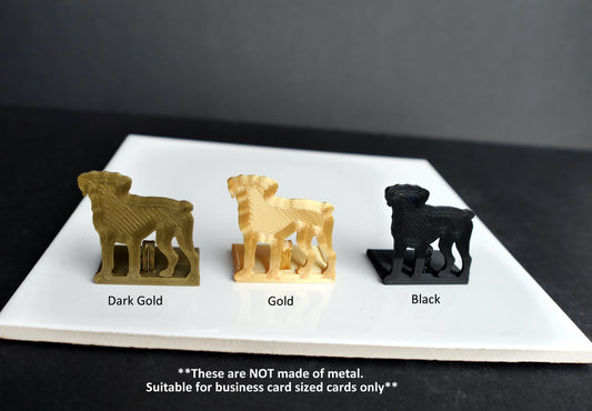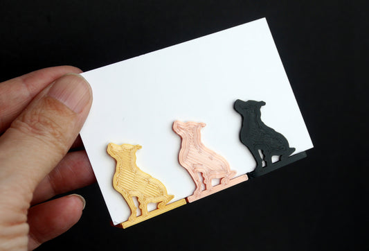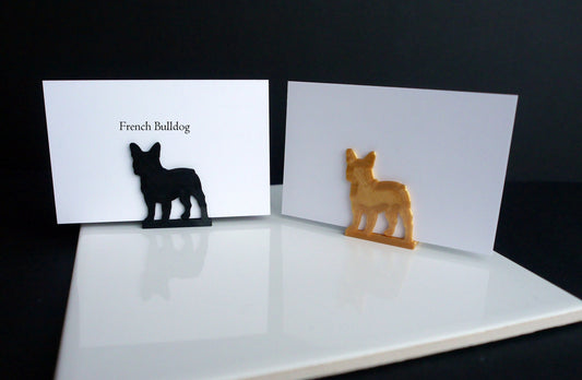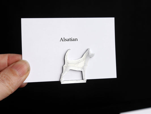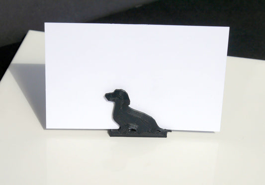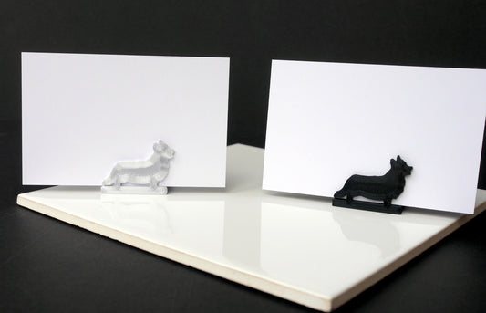 A collection of Dog Shaped Card Stands (Alsatian, Corgi, Pug, Frenchie, Shiba Inu, Dachshund, Beagle etc). The stands are to hold Name Cards for weddings, parties and events. They are 3D printed and made from PLA Filament (PLA is a fully biodegradable thermoplastic polymer consisting of renewable raw materials).