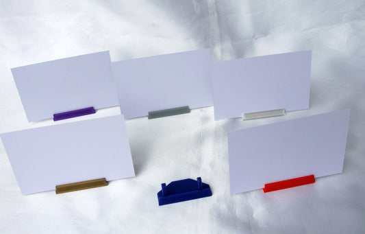A collection of 3d printed card stands. Stands hold card that is the size of a business card, and are great for place settings at events, parties and weddings. They are lightweight so not suited to outdoor events. Select amount required using drop down menus. These are NOT metal.