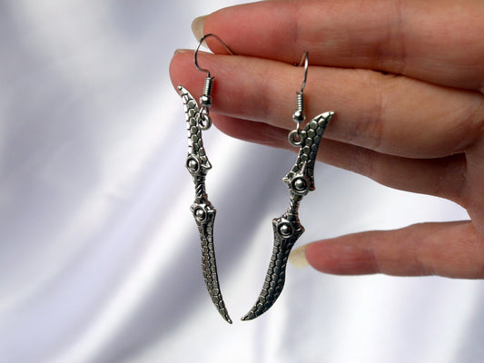 Silver Tone Warglaive Weapon Shaped Earrings (Ear Hook, Stud and Clip On)