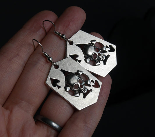 Skull Playing Card Shaped Silver Tone Earrings (Ear Hook, Stud and Clip On)