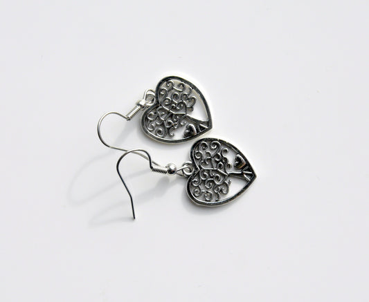 Silver Toned Tree of Life Shape Filigree Heart Earrings (Ear Hook, Stud or Clip On)