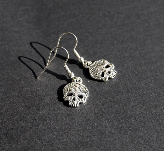 Small Silver Skull Head Gothic Earrings (Ear Hook, Stud and Clip On)