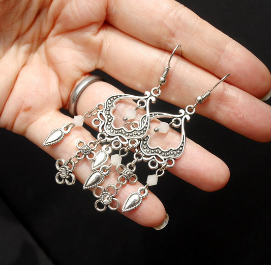 Silver and White Filigree Dangling Earrings (Ear Stud, Hook and Clip On)