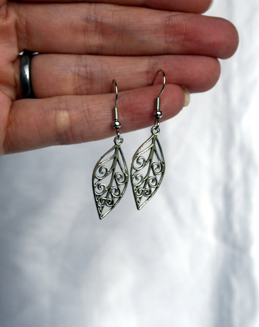 Silver Toned Small Leaf Filigree Earrings (Ear Hook, Stud and Clip On)
