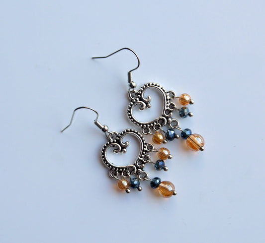 Silver Black and Orange Statement Filigree Earrings (Ear Hook, Stud and Clip On)