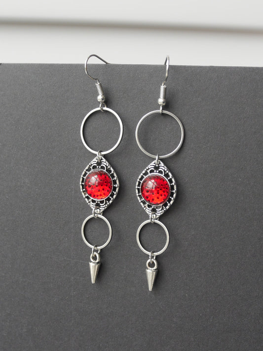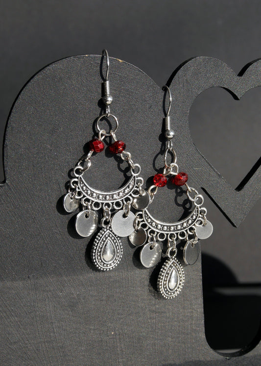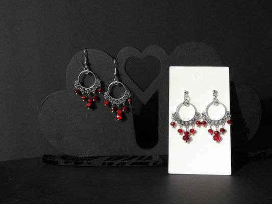 Silver and Red Filigree Earrings (Ear Hook, Stud and Clip On)
