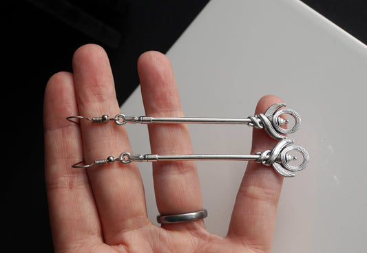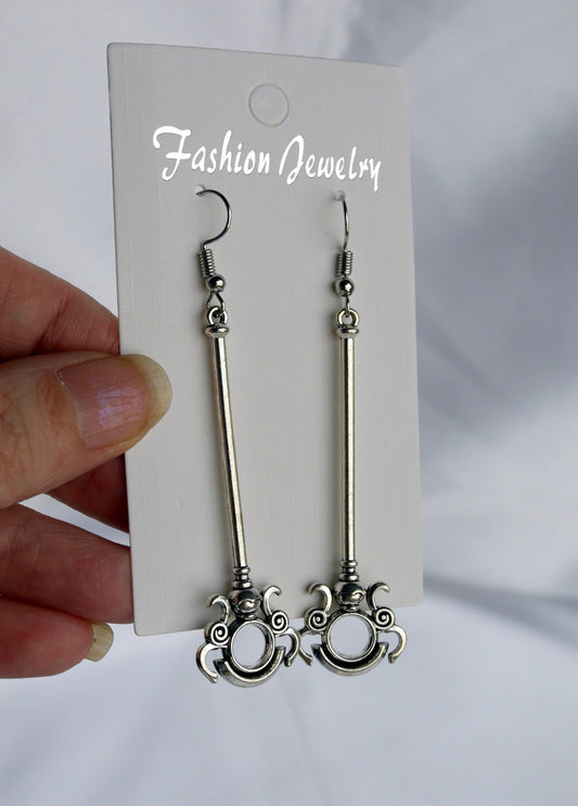 Silver Toned Two Handed Staff Style Weapon Earrings (Ear Hook, Stud and Clip On)