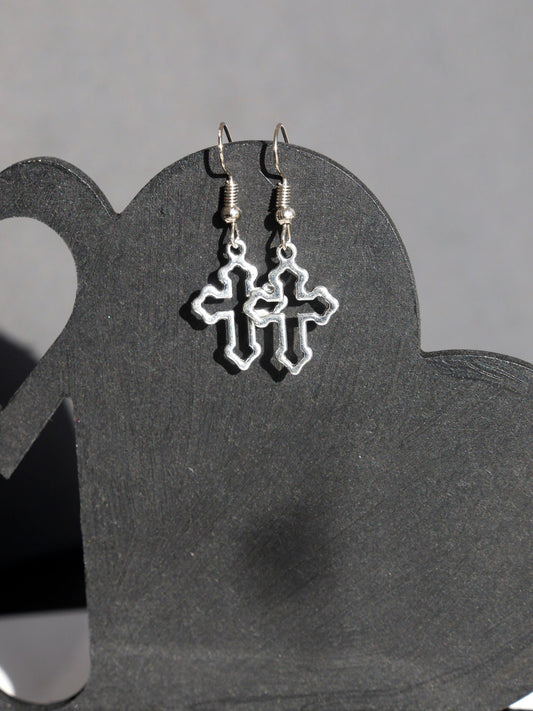 Small Silver Tone Holy Cross Shaped Earrings (Ear Hook, Stud or Clip On)