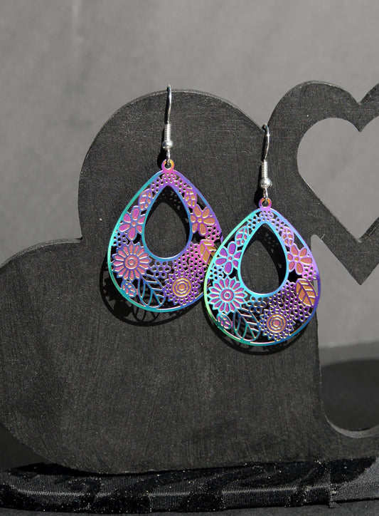 Colourful Iridescent Teardrop Filigree Statement Earrings (Ear Hook, Stud and Clip On)