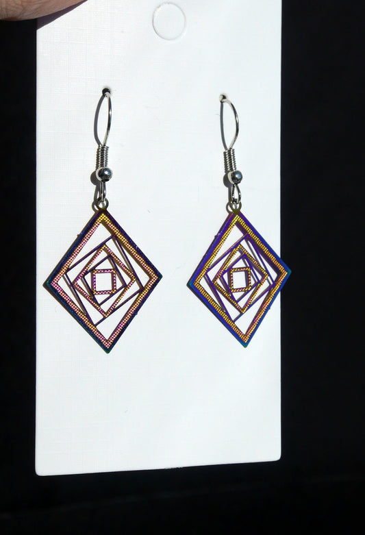 Colourful Iridescent Diamond Square Shape Filigree Earrings (Ear Hook, Stud or Clip On)