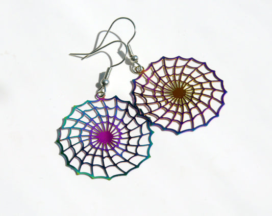 Colourful Rainbow Iridescent Spider Web Shaped Filigree Earrings (Ear Hook, Stud or Clip On)