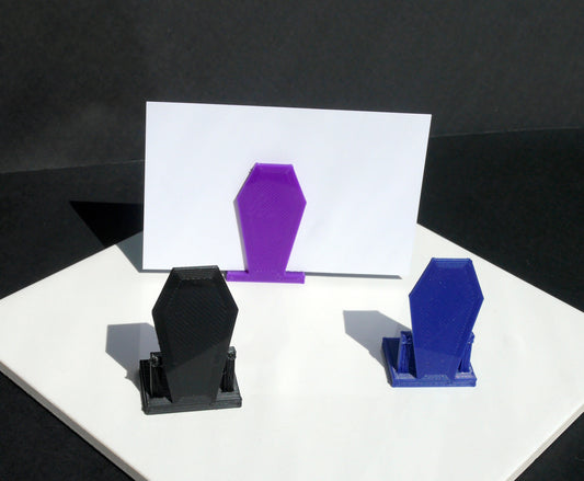 A collection of Gothic Themed Card Stands (Skulls, Bats, Ravens, Spiders etc). The stands are to hold Name Cards for weddings, halloween parties and events. They are 3D printed and made from PLA Filament (PLA is a fully biodegradable thermoplastic polymer consisting of renewable raw materials).
