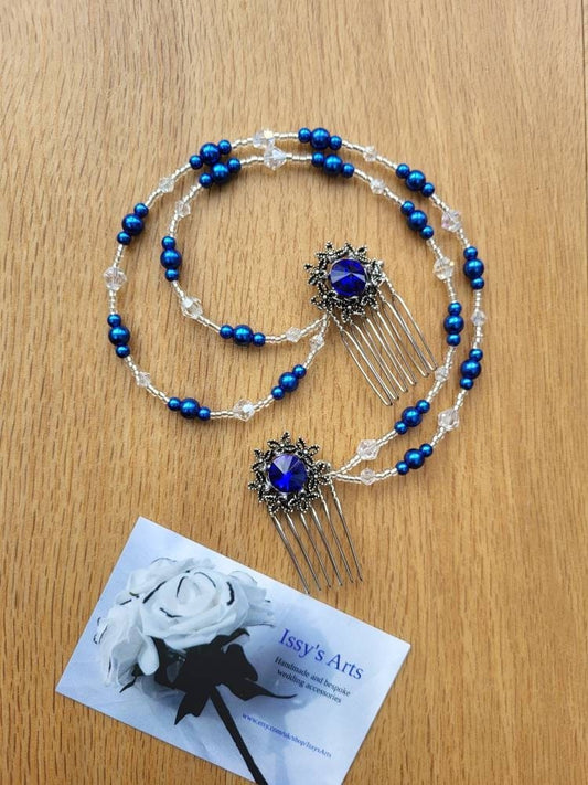 Blue Pearl and Rhinestone Prom Wedding Hair Chain Accessory