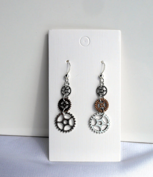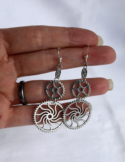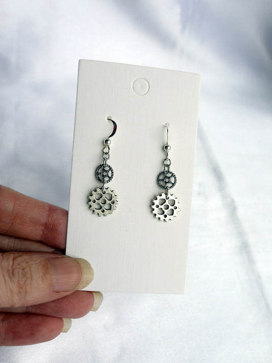 Silver Tone Gear and Cog Steampunk Earrings (Ear Hook, Stud and Clip On)
