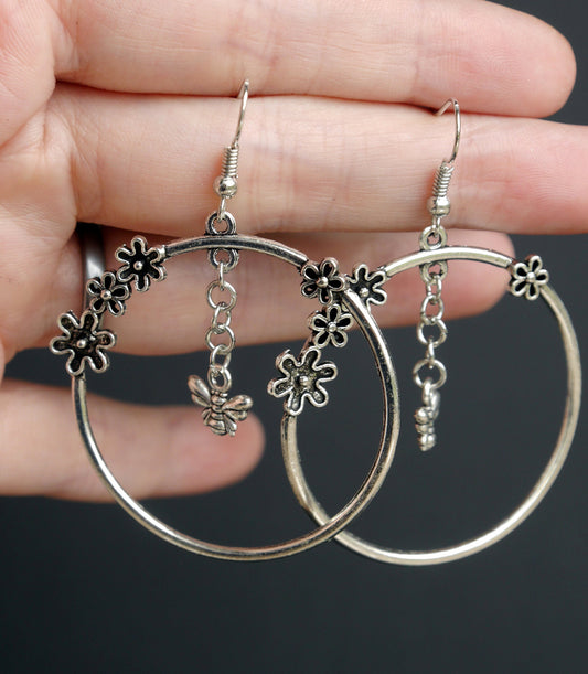 Silver Honeybee and Hoop Flower Earrings (Ear Hook, Stud and Clip On)