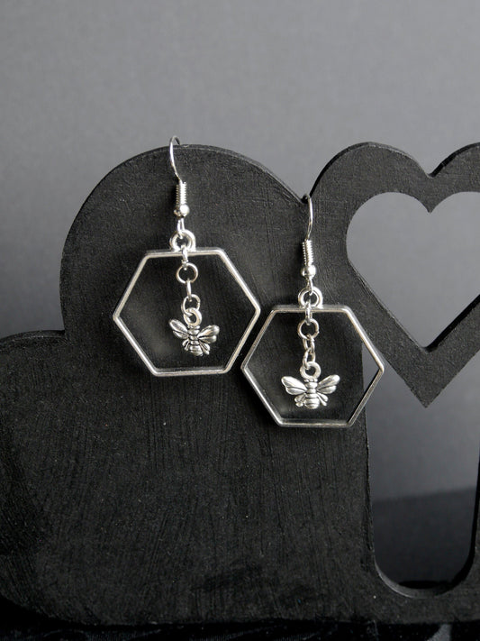 Silver Toned Honeybee Hexagon Earrings (Ear Hook, Stud and Clip On)