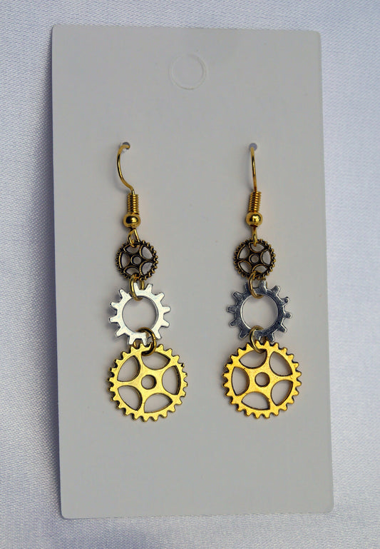 Gold and Silver Toned Cog Gear Wheel Industrial Steampunk Earrings