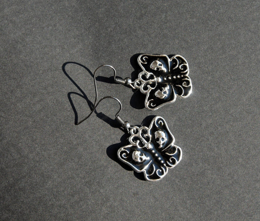 Gothic Black Butterfly and Silver Skull Earrings (Ear Hook, Stud or Clip On)