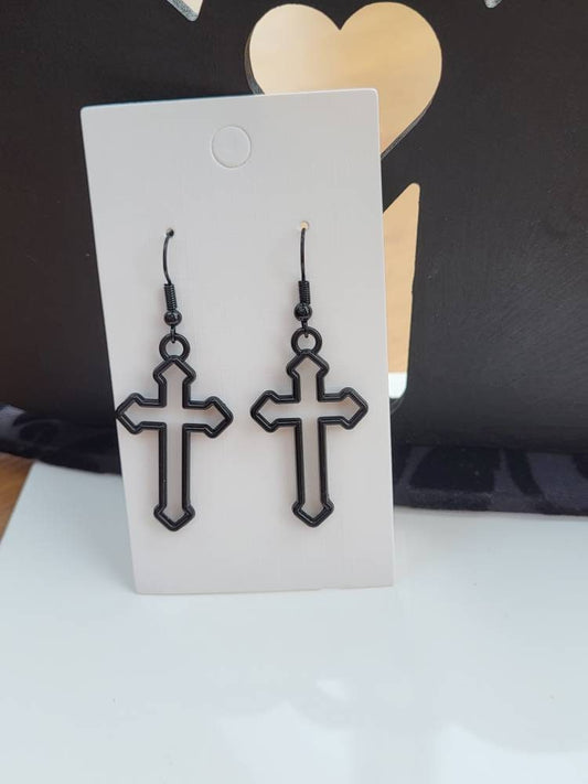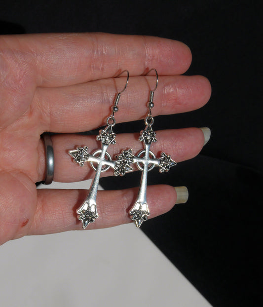Gothic Antique Silver Tone Christian Cross Earrings (Ear Hook, Stud or Clip On)