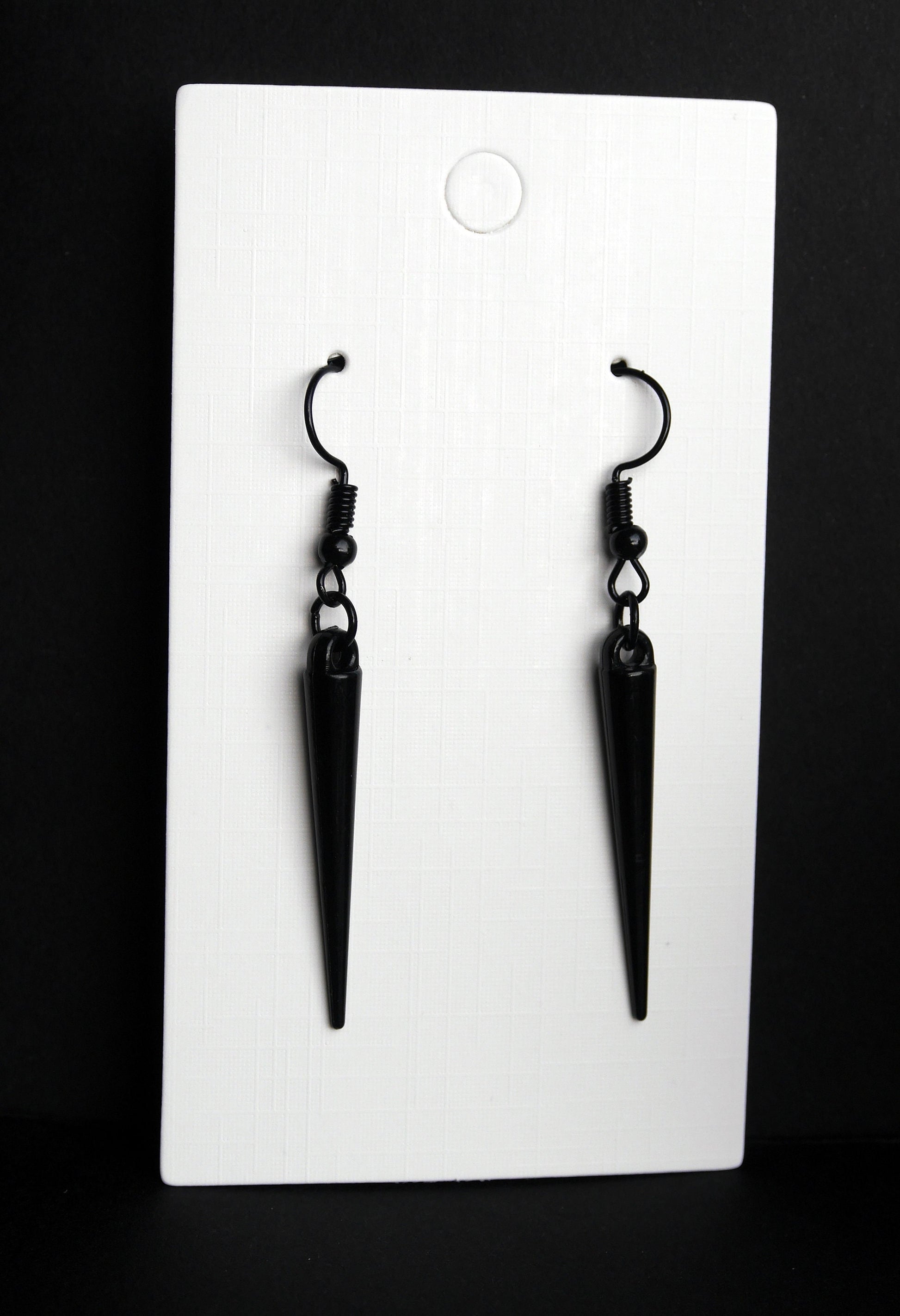 Large Spike - Earring length is 40 mm (4 cm / 1.5 inches approx) from bottom of hook. Spike is 0.3 cm width by 3.4 cm length approx. Earrings hooks are gun metal.
