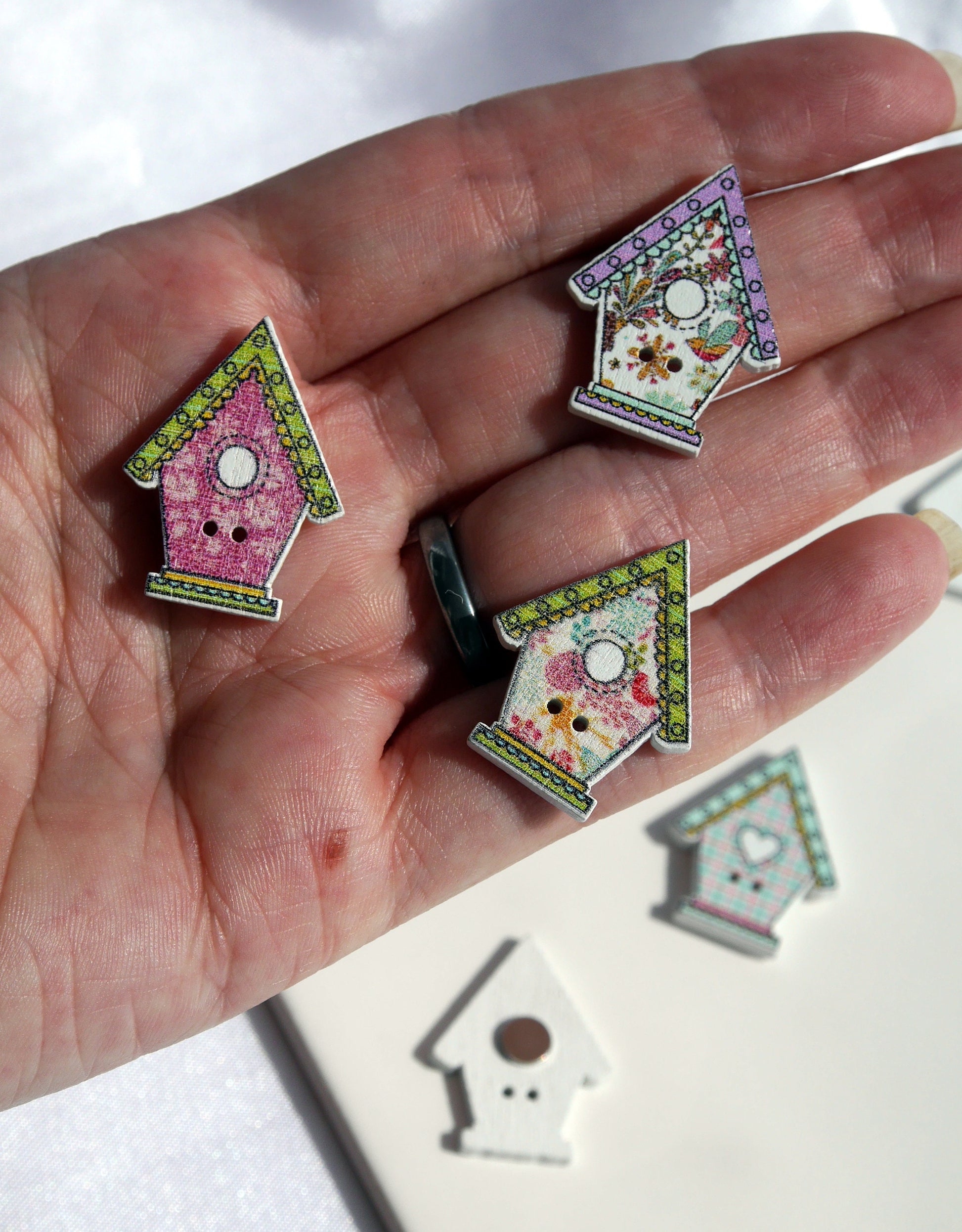 A set of 5 Bird House shaped wooden magnets. The Bird Houses are made from wooden buttons, with a strong Neodymium Magnet (sized 5 mm) attached to the reverse.