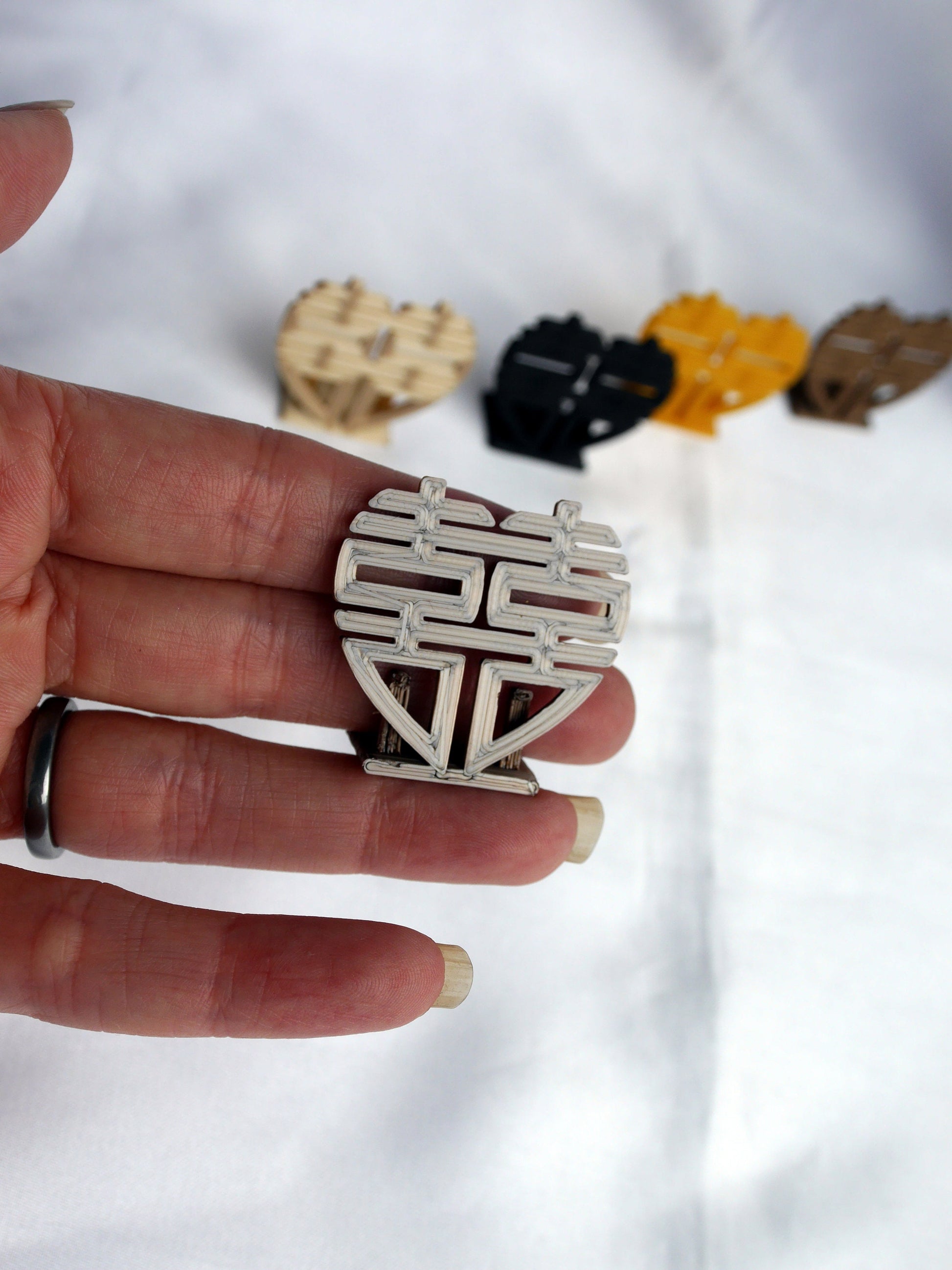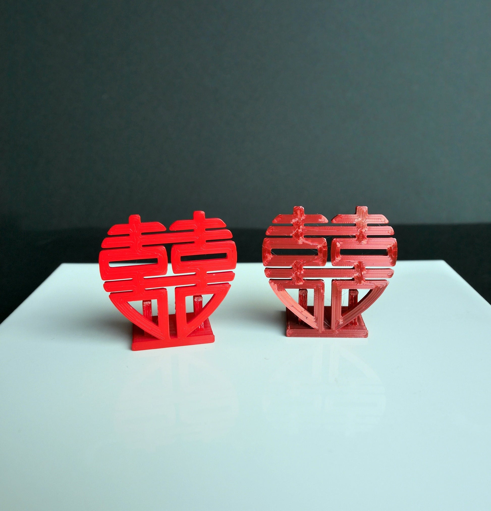 A 3D printed heart shaped Chinese double happiness symbol name display holder (for wedding /events / party seating) made with plastic PLA filament.