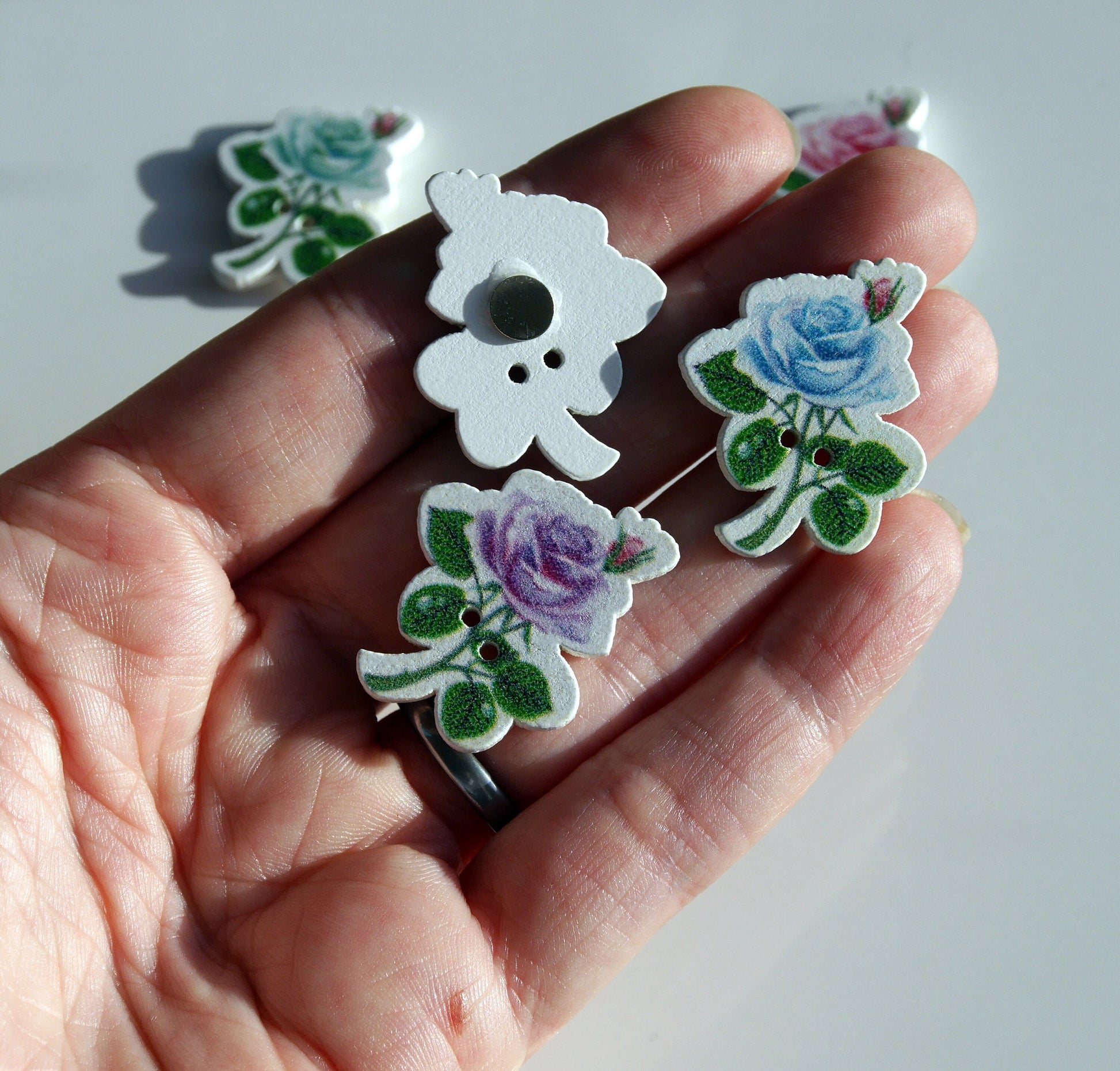 A set of 5 Rose Flower shaped wooden magnets. The Flowers are made from wooden buttons, with a strong Neodymium Magnet (sized 5 mm) attached to the reverse.