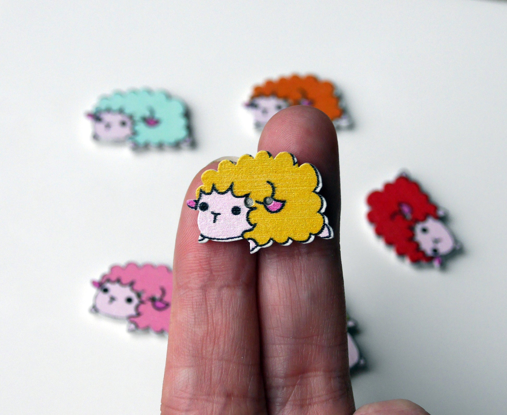 A set of 5 Farmyard Animal Sheep shaped wooden magnets. The sheep are made from wooden buttons, with a strong Neodymium Magnet (sized 5 mm) attached to the reverse.