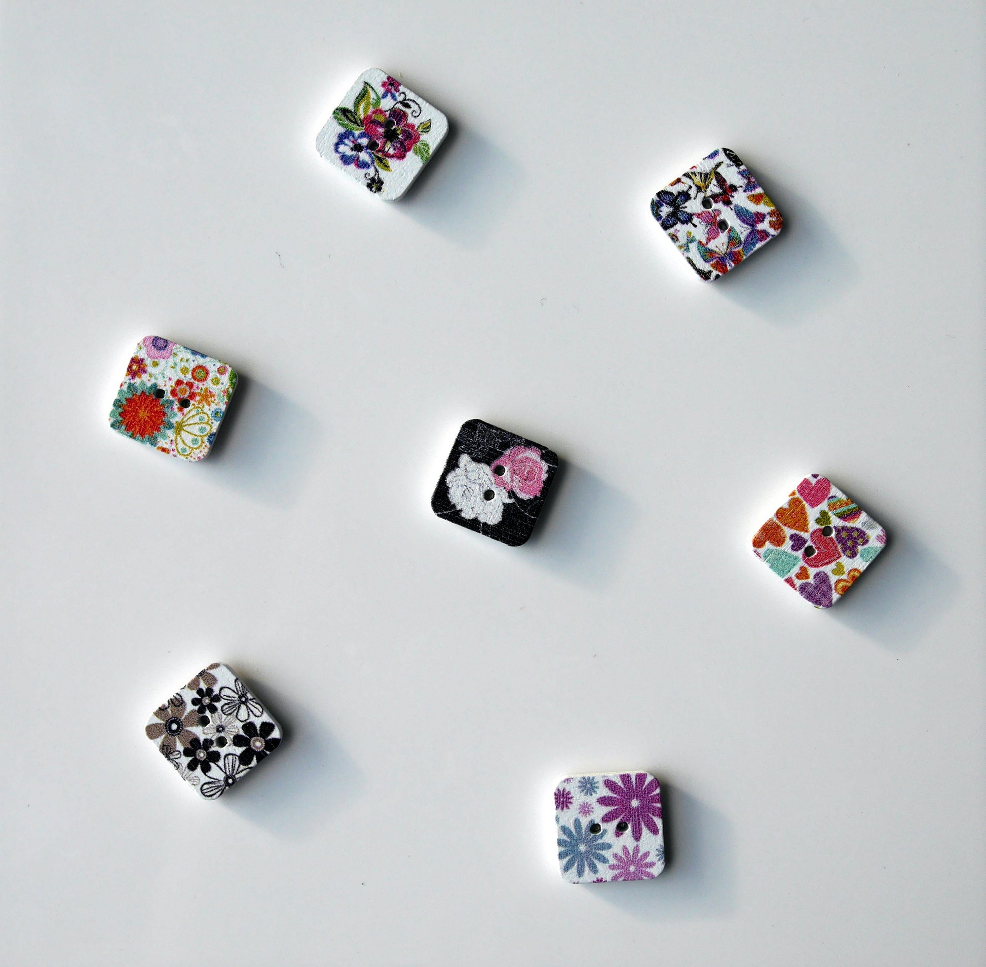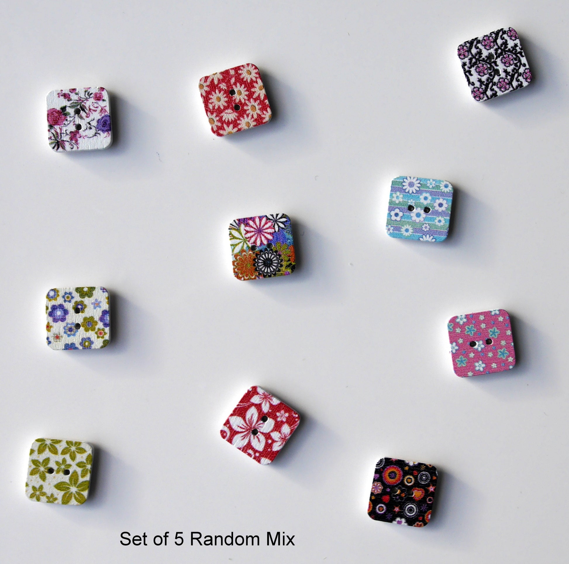A set of 5 Square shaped wooden magnets. The squares are made from wooden buttons, with a strong Neodymium Magnet (sized 5 mm) attached to the reverse.