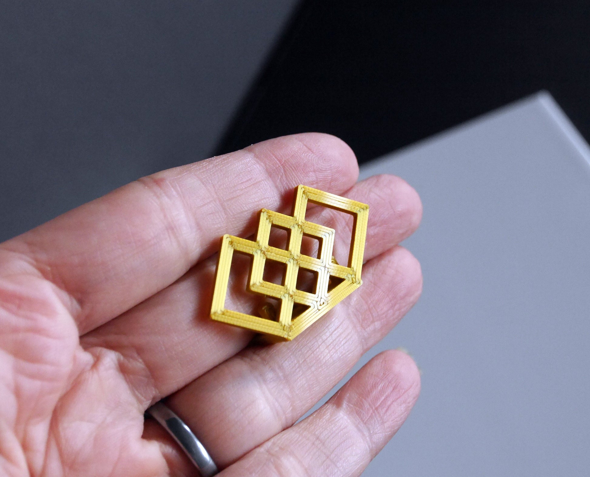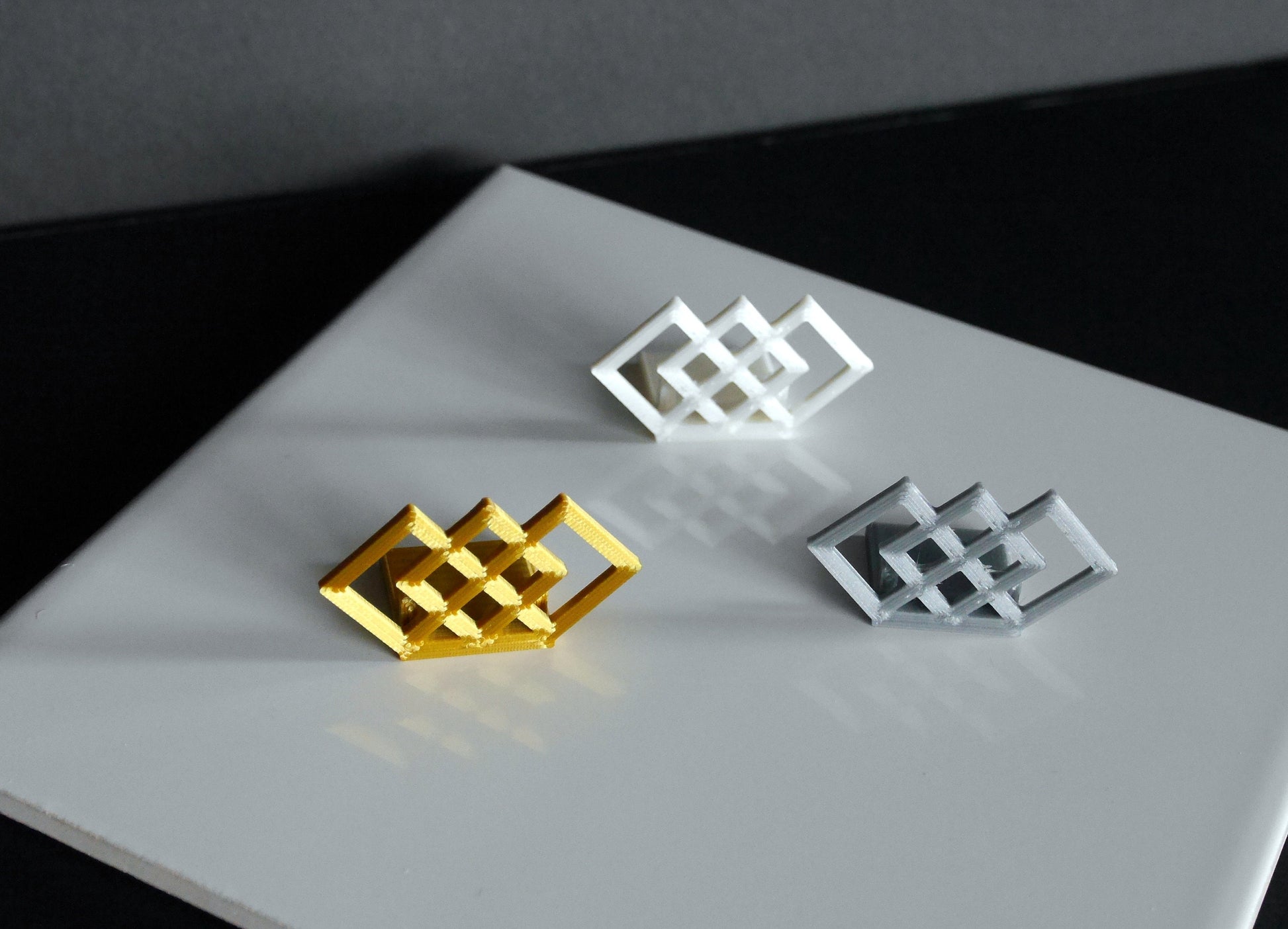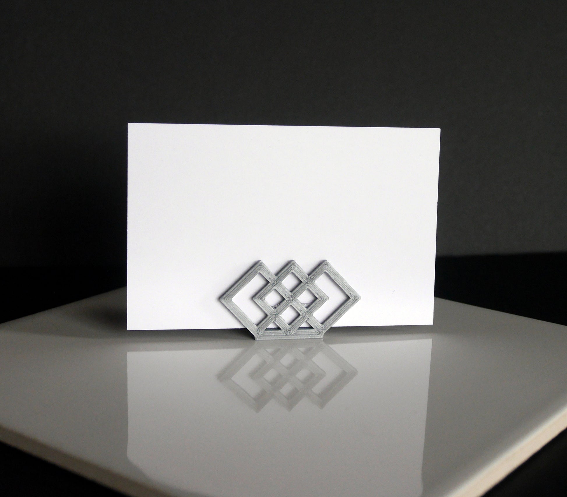 A 3D printed Geometric Shaped Wedding Name Stand, Art Deco Style Name Holder, Gatsby Theme Name Displays, Gatsby Place Holder, Gatsby Seating Name Holder, (for wedding / event / party seating) made with plastic PLA filament. PLA is a fully biodegradable thermoplastic polymer consisting of renewable raw materials.