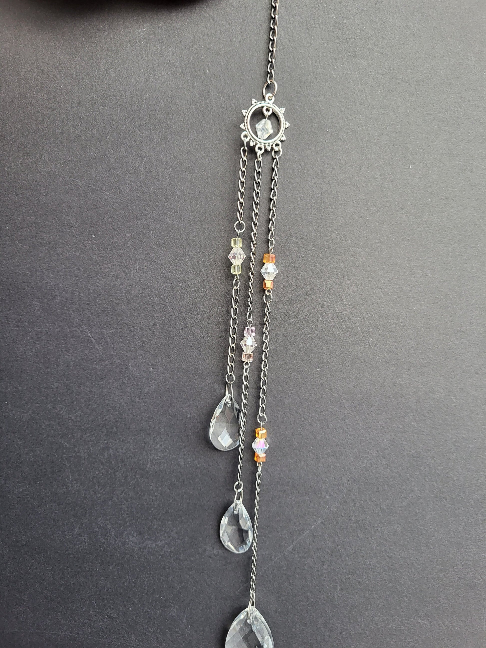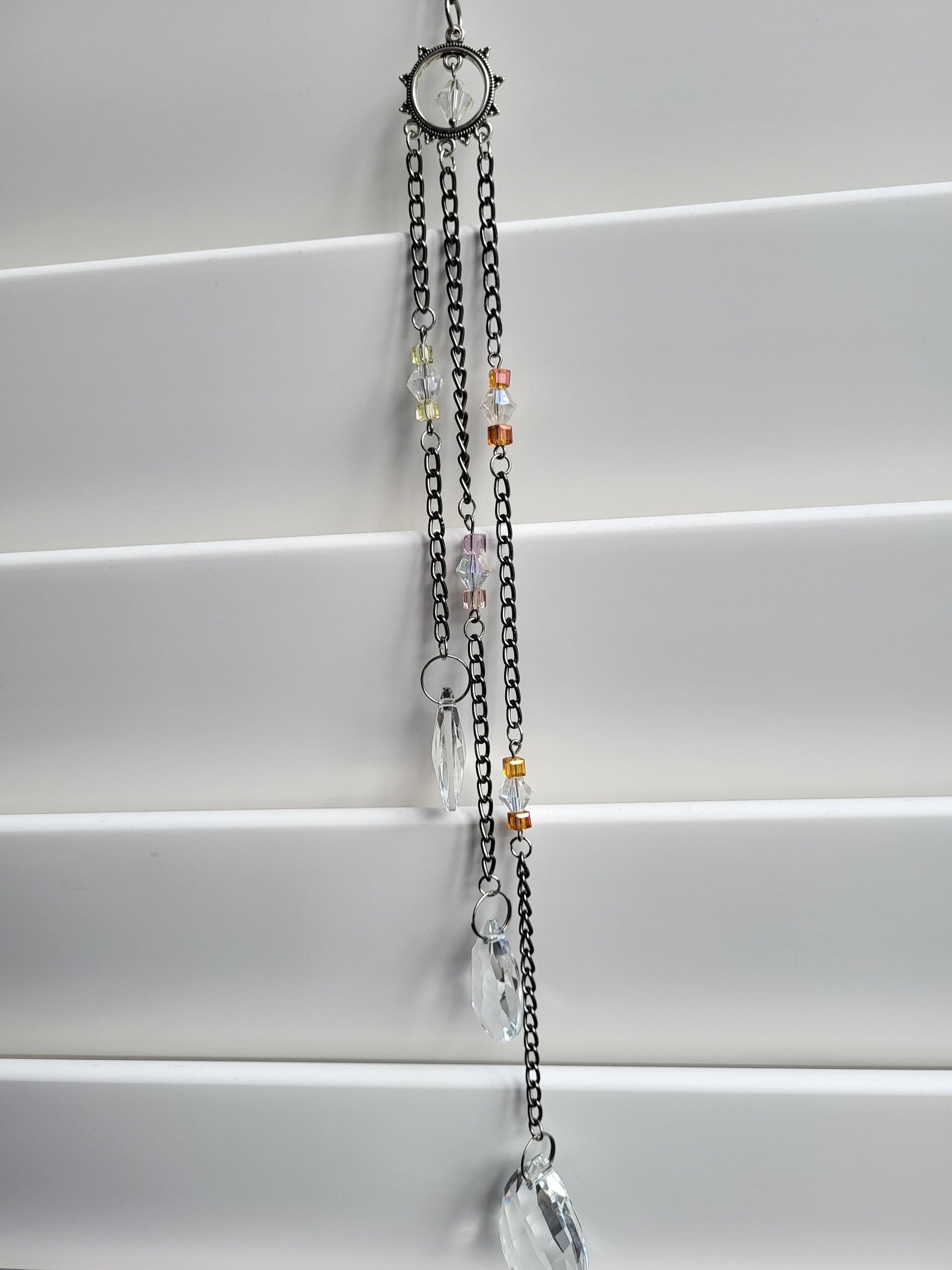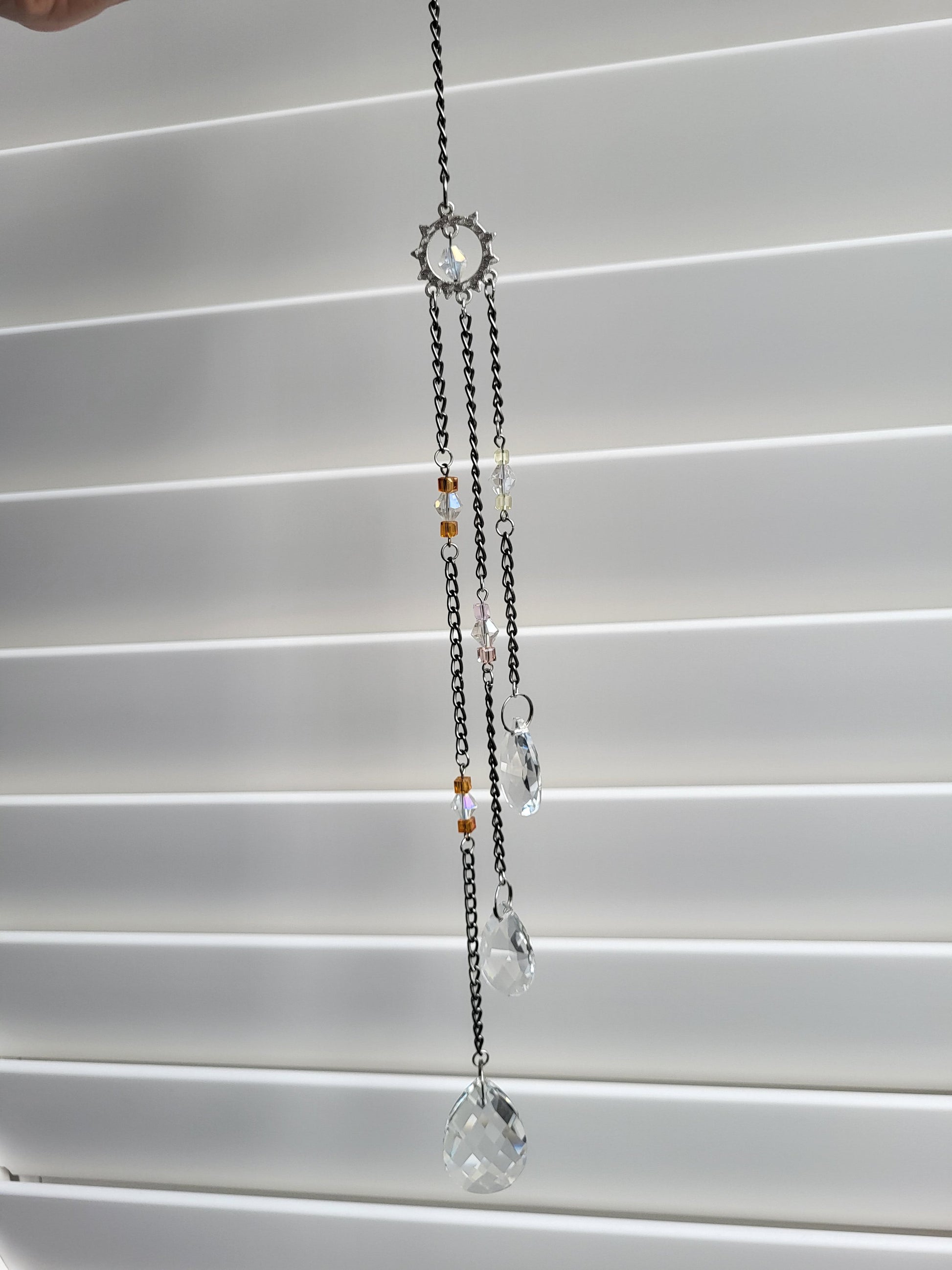 The sun catcher measures 38 cm (15 inches approx) from top to bottom and is made with a 8 cm gun metal silver toned thick (3 mm) chain to the top section with a silver plated ring for hanging (0.8 cm). This connects to the silver toned charm which is 2.5 cm by 2 cm. From here, you have 3 hanging chain strands in varying length, the longest is 26 cm (260 mm / 10 inches) which hang a combination of glass elements and connectors to give the overall delicate look and refractive effect. There are three glass prisms that hang off each strand, they are 2 x 2.7 cm by 2 cm (1 inch x 0.75) and 1 x 3.7 cm by 2.5 cm (1.5 inches by 1 inch).