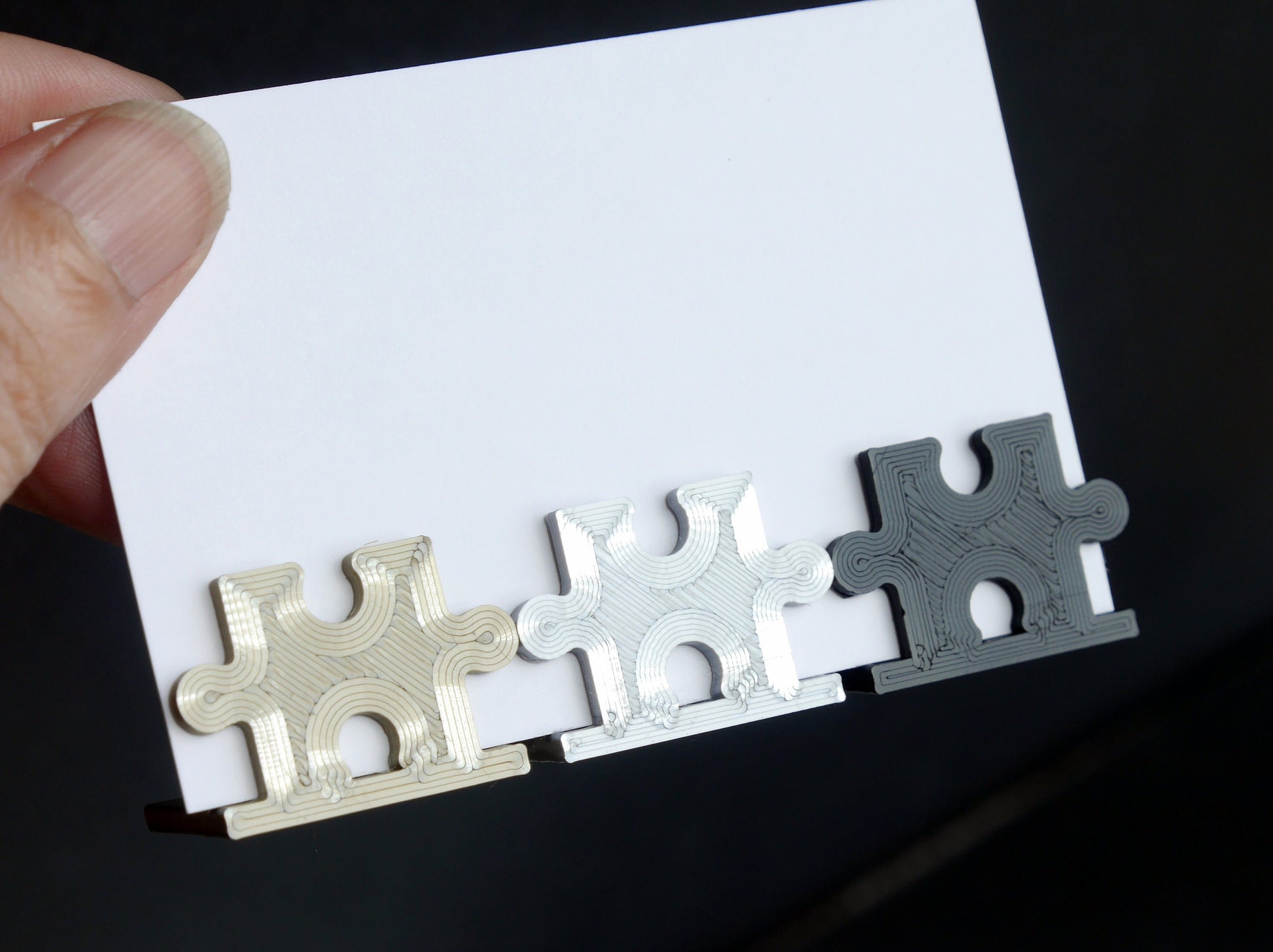 A 3D printed Jigsaw Puzzle Piece Name Stand Display, Puzzle Shaped Table Name Holder, Jigsaw Seating Name Holder, Puzzle Game Shaped Wedding Name Holders (for wedding / Event / party seating) made with plastic PLA filament.