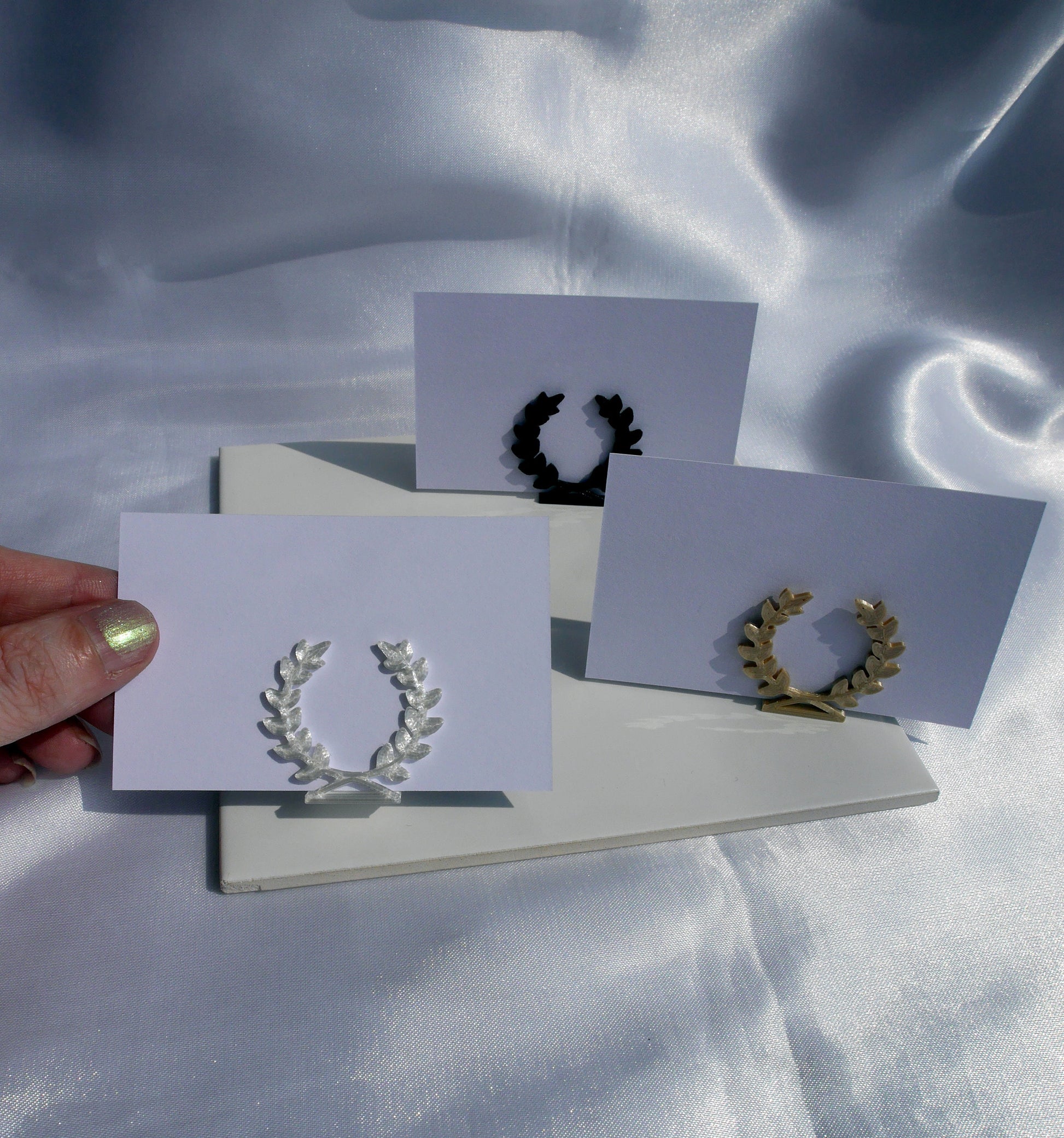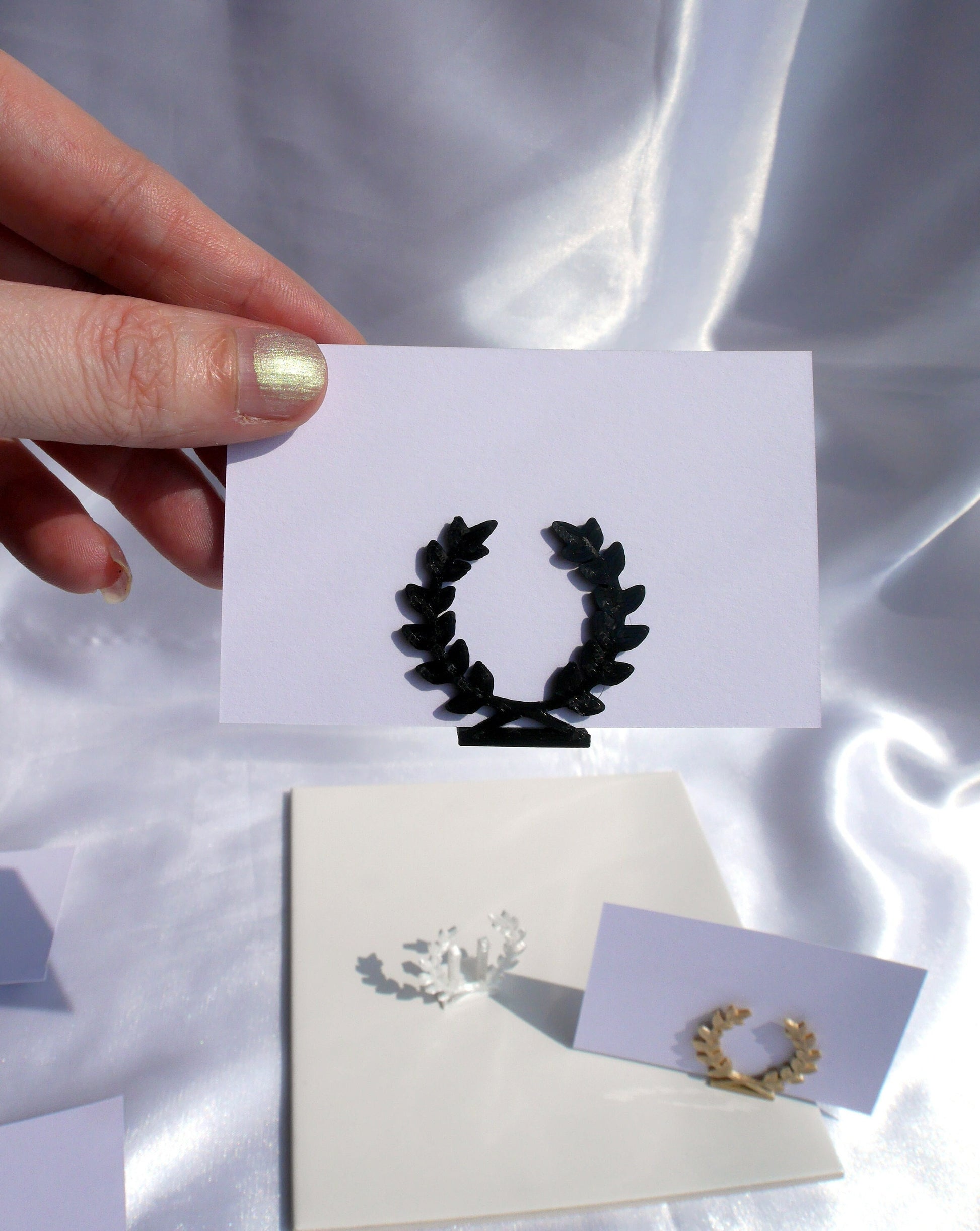 A 3D printed Laurel Wreath Shaped Seating Name Holders, Hellenic Style Wedding Name Stand, Wedding Name Display, Greek Wreath Symbol Place Holder (for wedding tables / party seating) made with PLA filament.