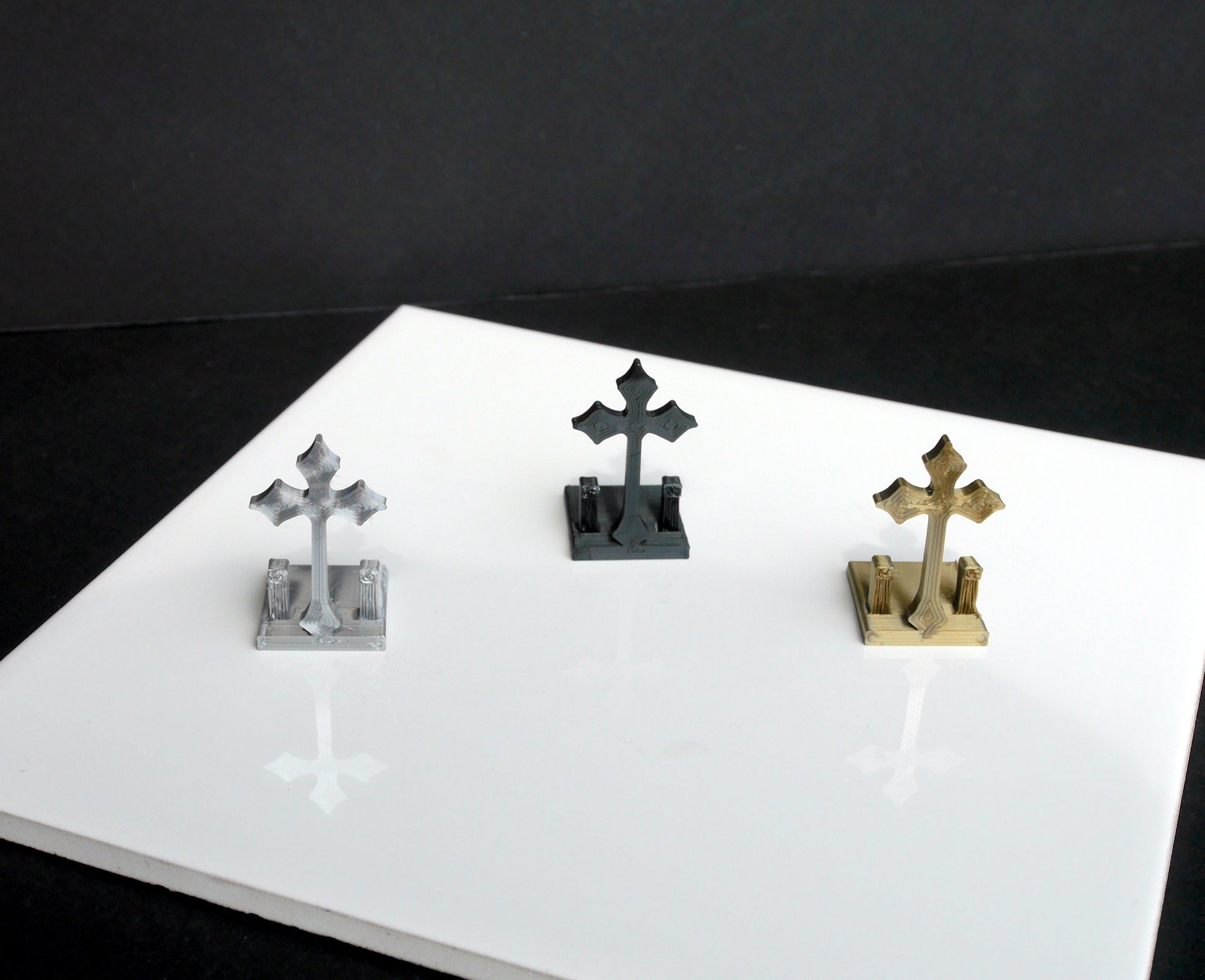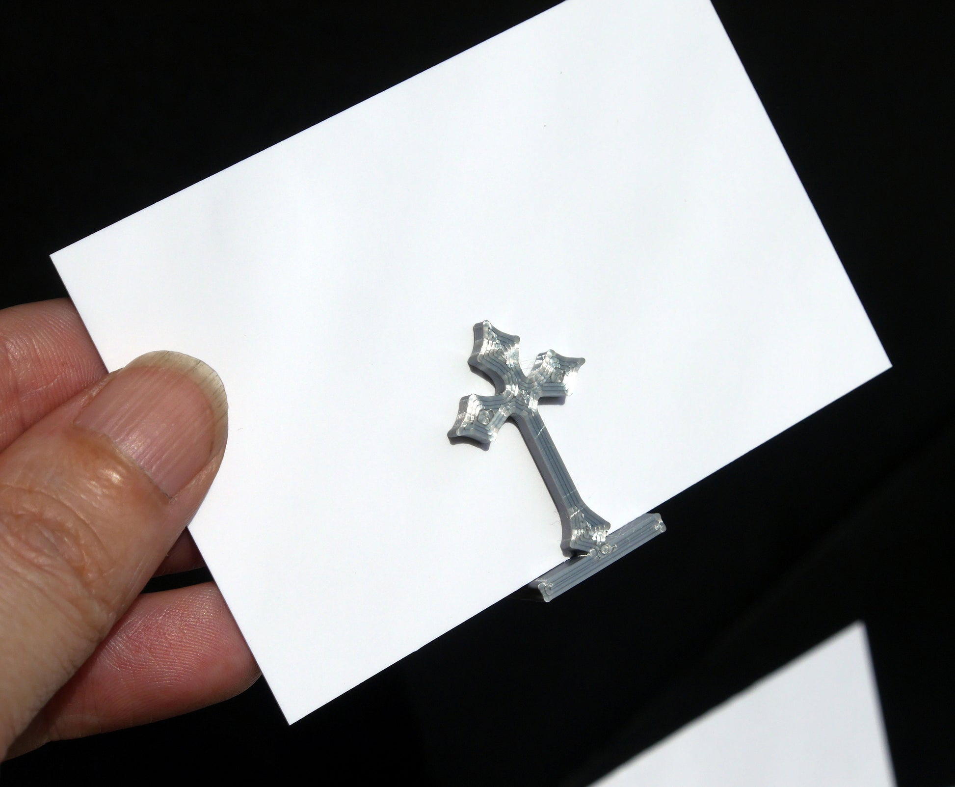 A 3D printed Ornate Cross Wedding Name Stand Display, Cross Shaped Table Name Holder, Cross Seating Name Holder, Christian Cross Wedding Name Holders (for wedding / events / party seating) made with PLA filament.