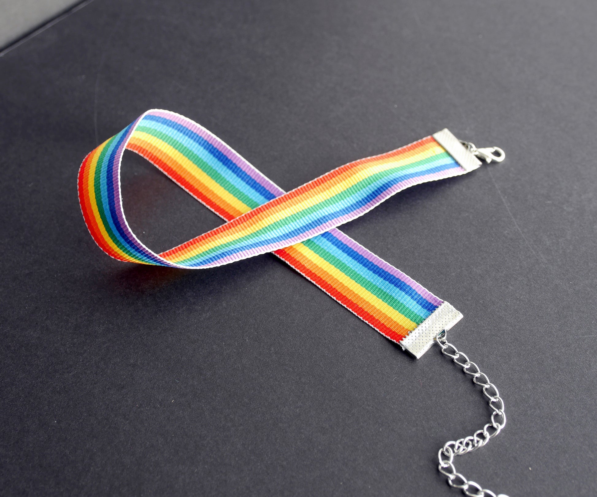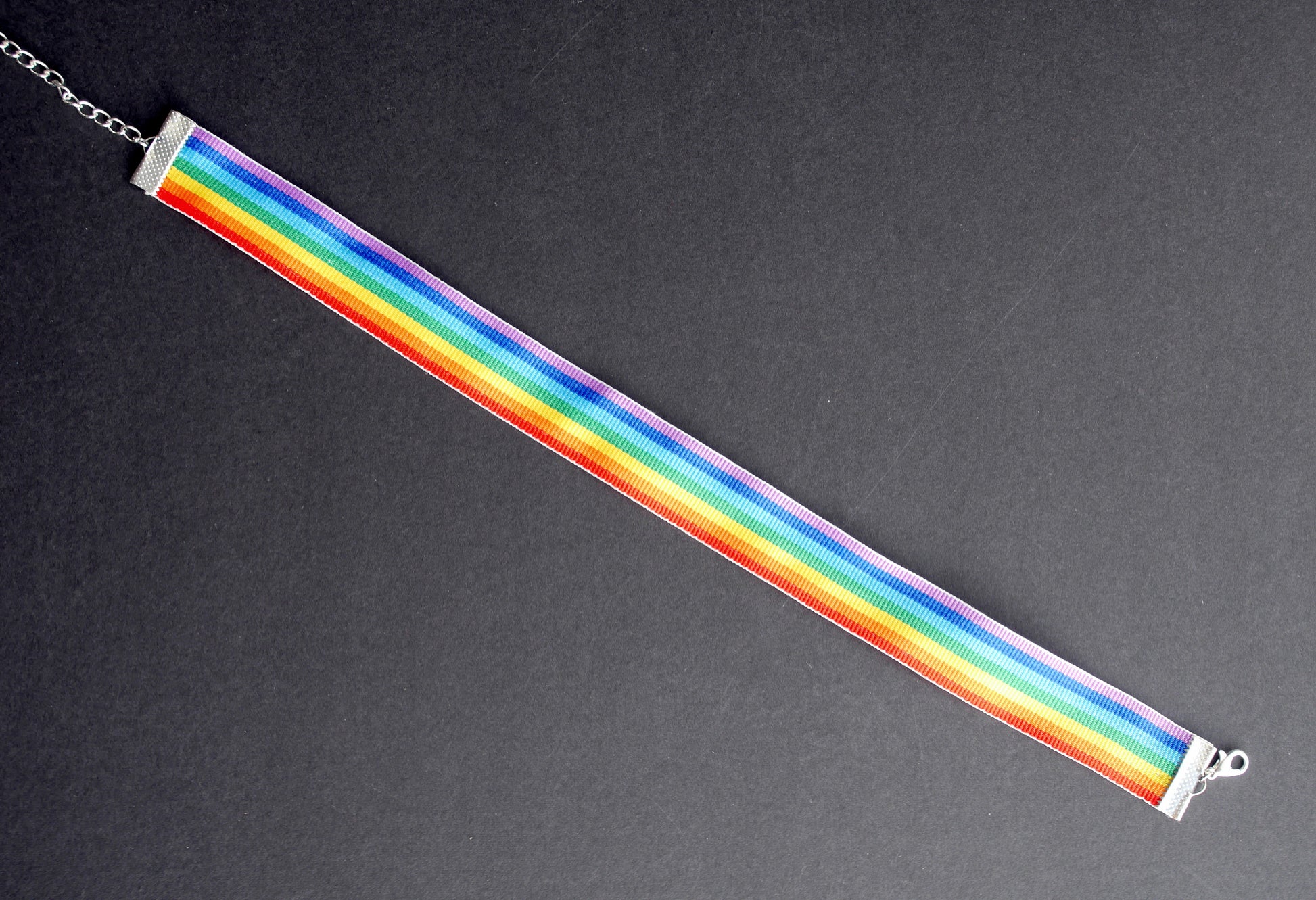 A soft rainbow choker/ rainbow necklace with silver plated ends. The material is not elasticated. Choker width is 2 cm. A fun item for festival, parades or party wear.