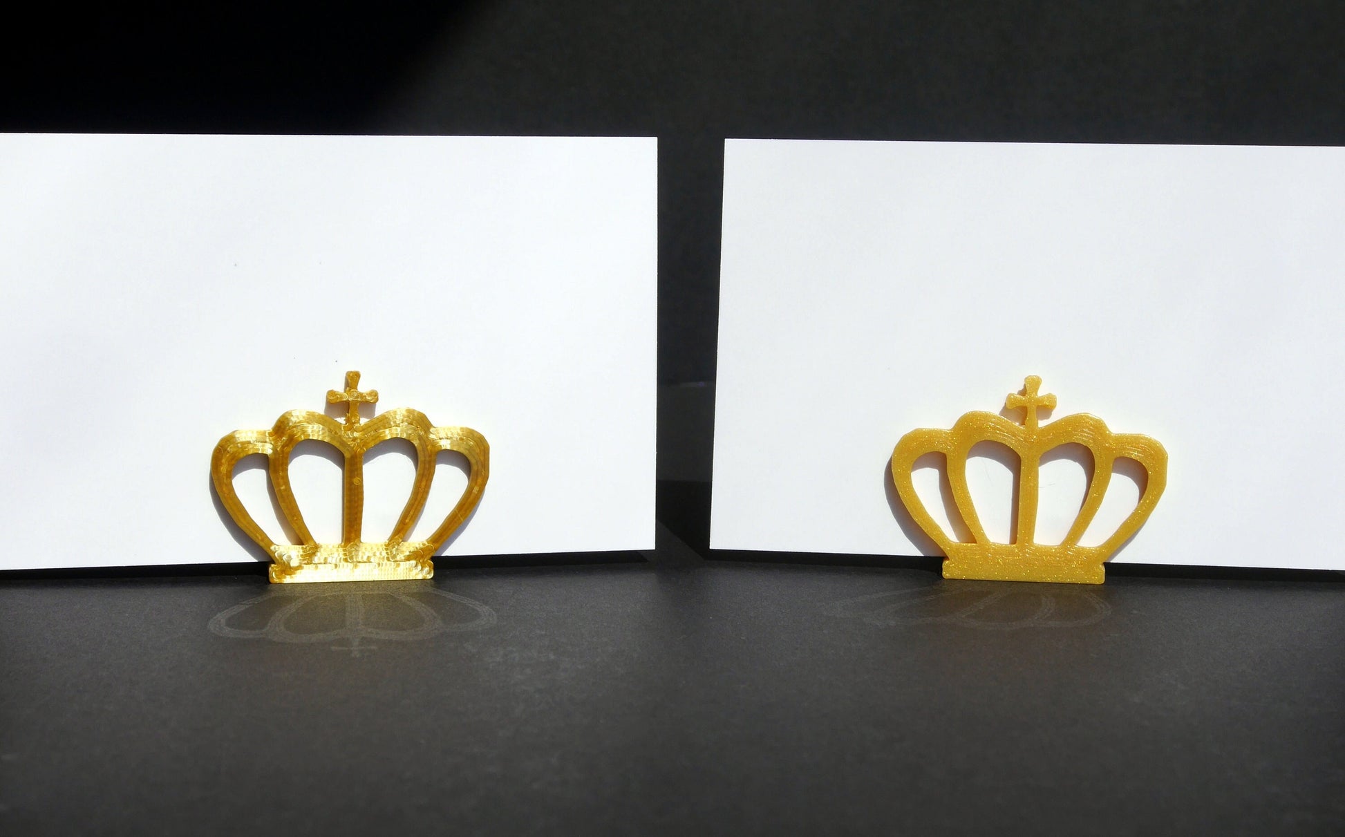 A 3D printed Crown Wedding Name Stand, Crown Wedding Name Display, Royal Crown Place Holder, (for wedding / event / party seating) made with plastic PLA filament. PLA is a fully biodegradable thermoplastic polymer consisting of renewable raw materials