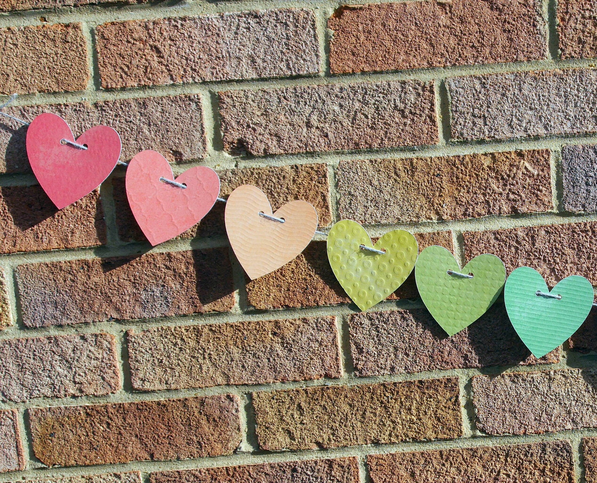This banner is made from card stock paper (250 gsm) shaped into hearts that measure 9 cm by 9 cm approx. The card paper is single sided and is made up of mottled pastel colours on one side with plain white on the other side. The card paper is embossed with different patterns on each colour (please see photos for details).