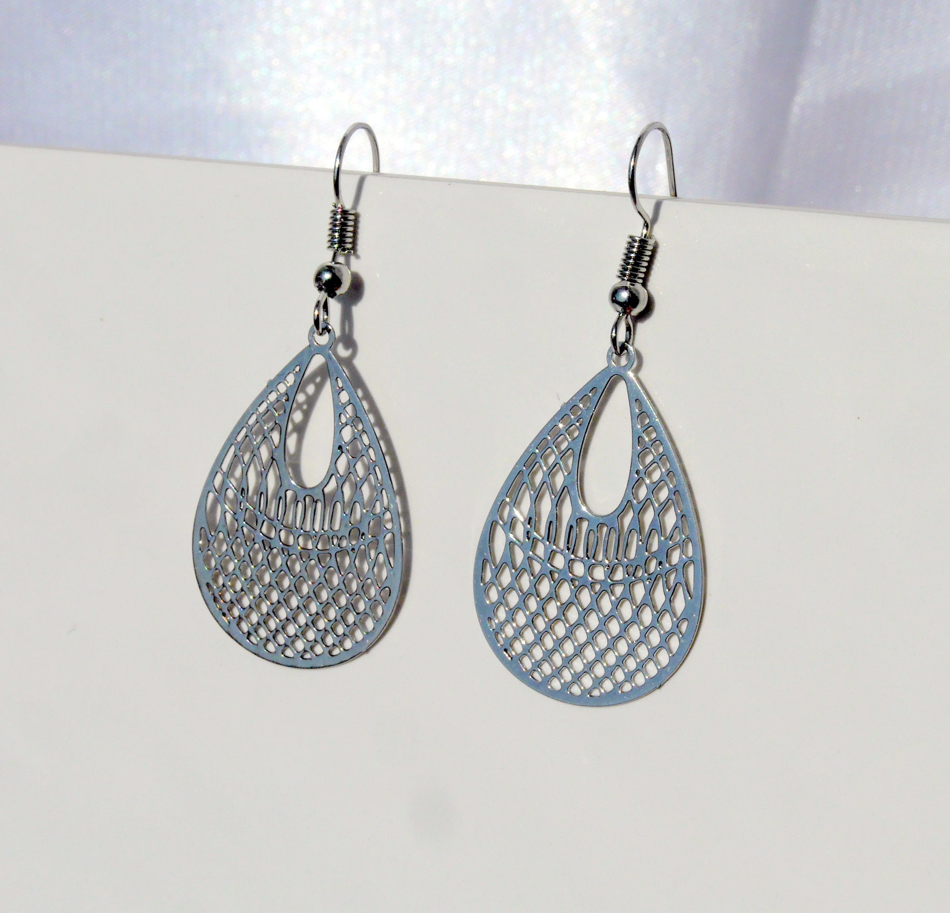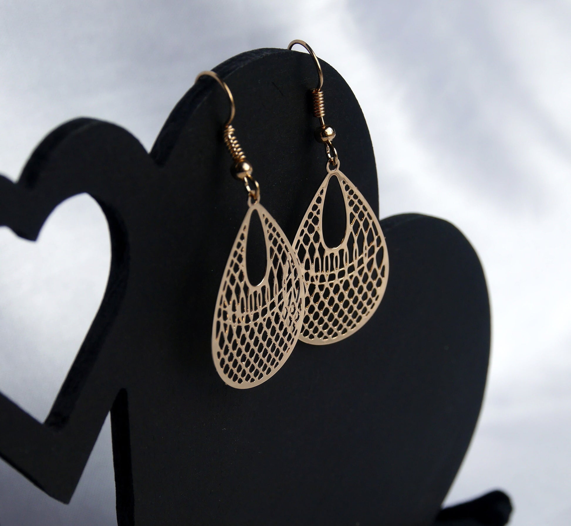 Made with silver plated or gold tone ear hooks. The earring length is 28 mm (2.8 cm / 1 inch approx) from bottom of hook. Teardrop filigree is 20 mm wide (2 cm approx). Filigree is very light weight and available in gold tone or silver tone.