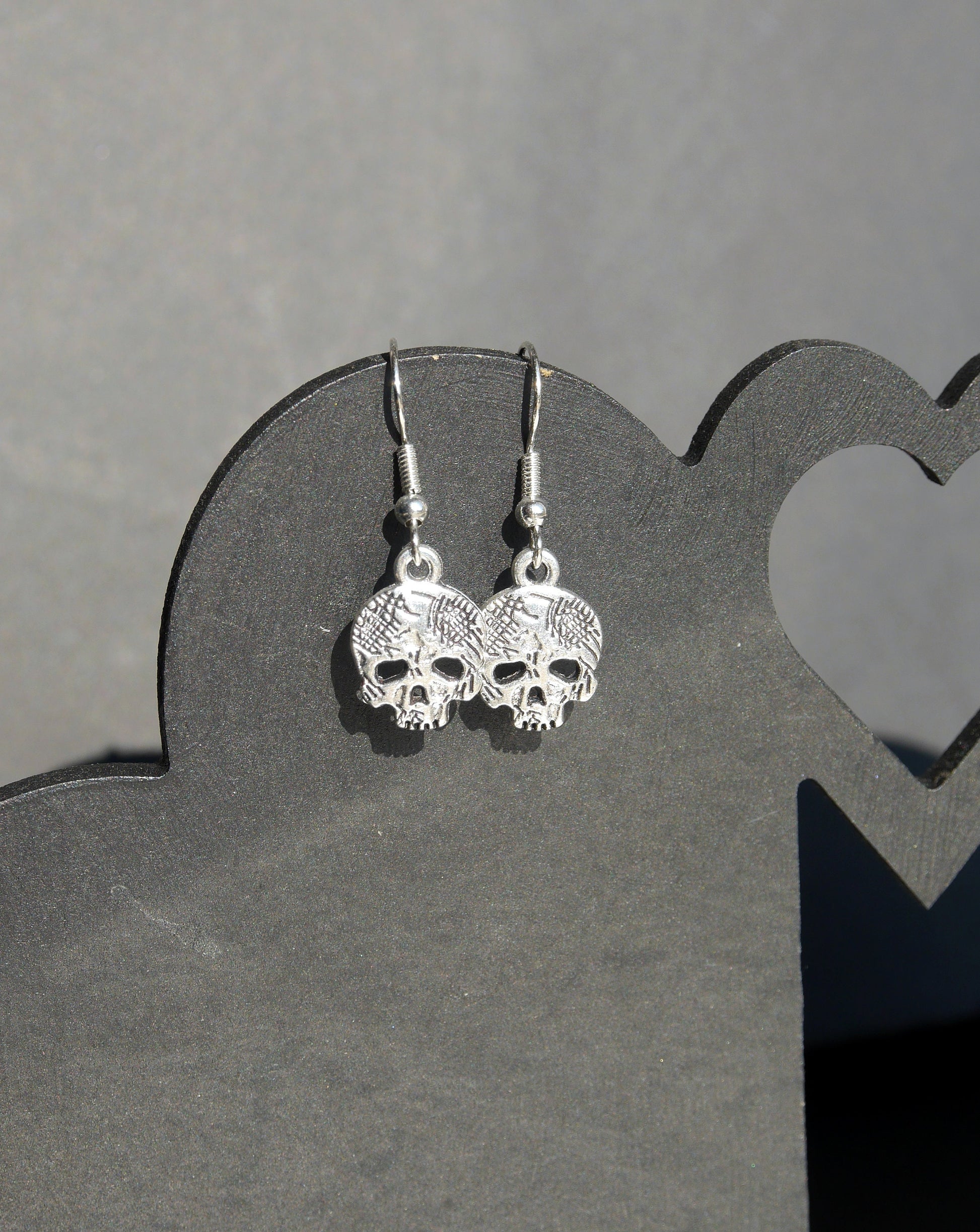 Small Silver Skull Head Gothic Earrings (Ear Hook, Stud and Clip On)
