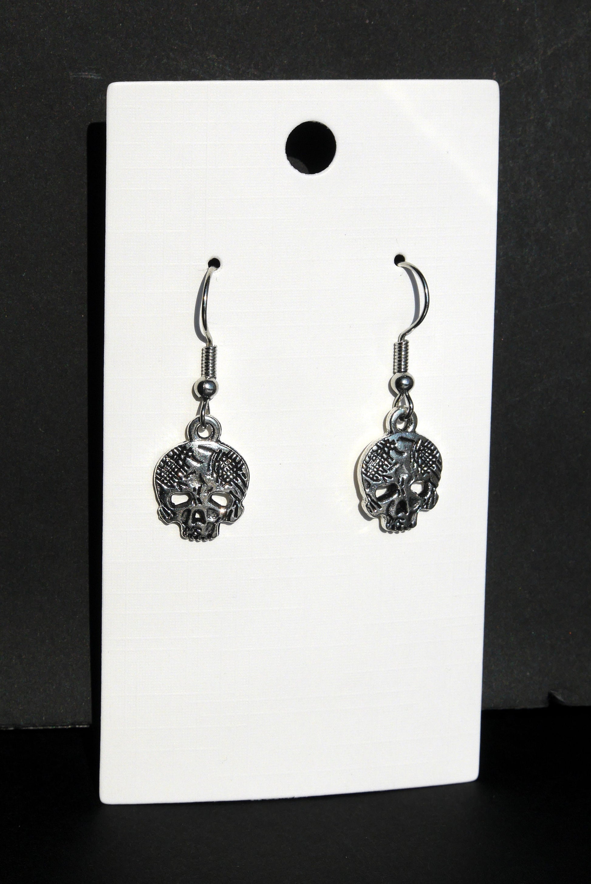 Skull charms are silver toned and are 1.5 cm (15 mm / just over half an inch) in length from earring base and 1.2 cm (12 mm) width at widest point. Reverse of the skull charm is blank. Ear hooks are silver toned. Ear Studs and Clip On also available.