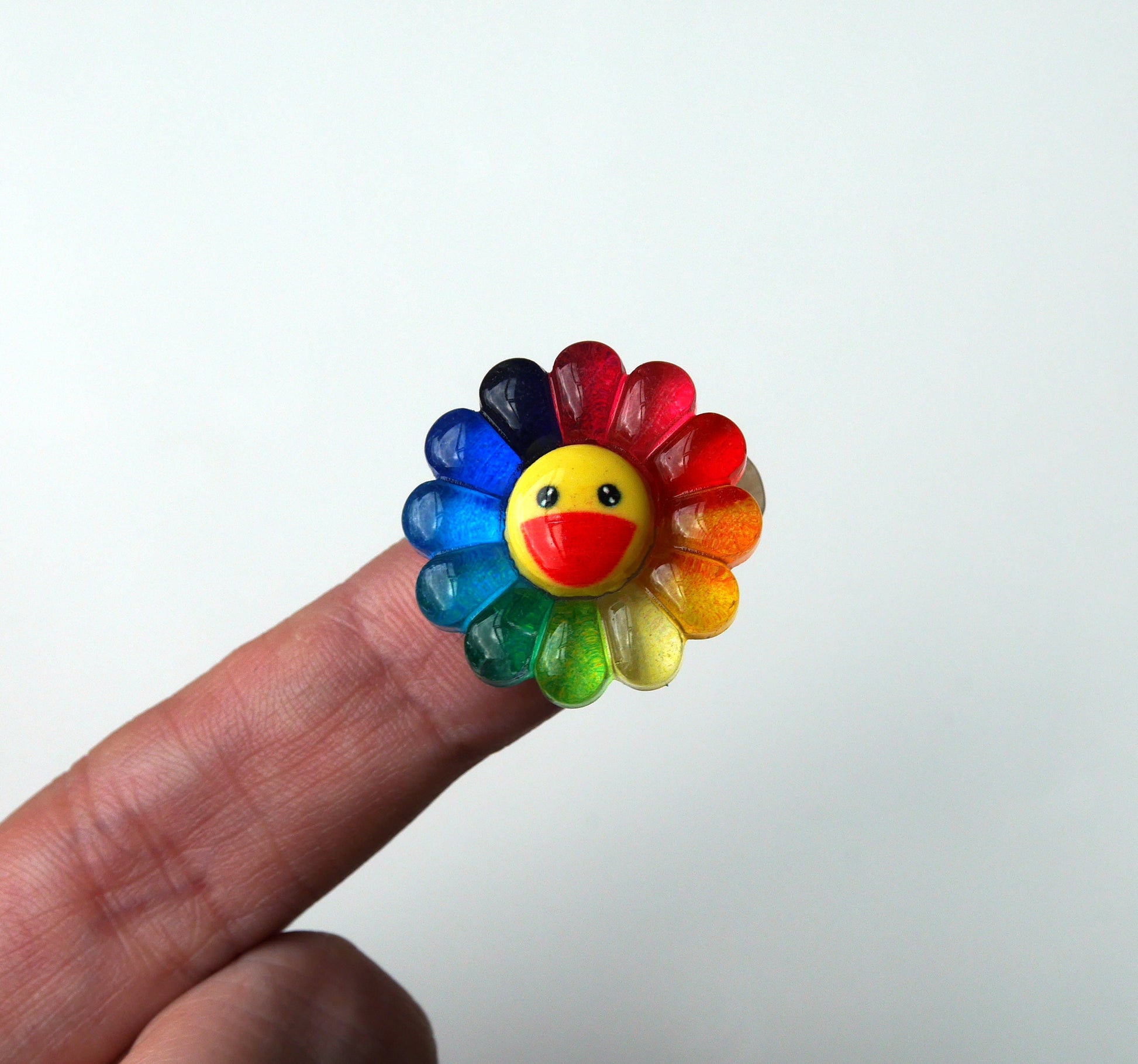 A set of 5 Happy Smiling Flower Face shaped resin magnets. The Happy Smiling Face's are made from resin with rainbow petals, with a strong Neodymium Magnet (sized 5 mm) attached to the reverse.