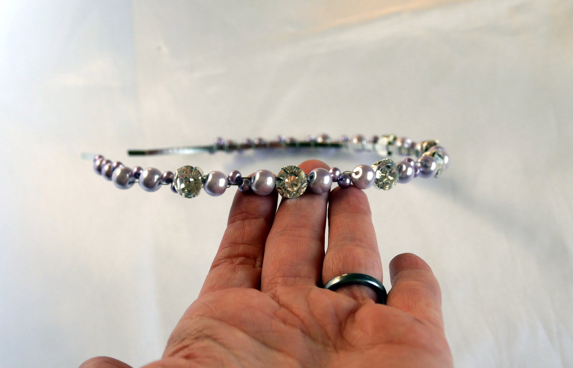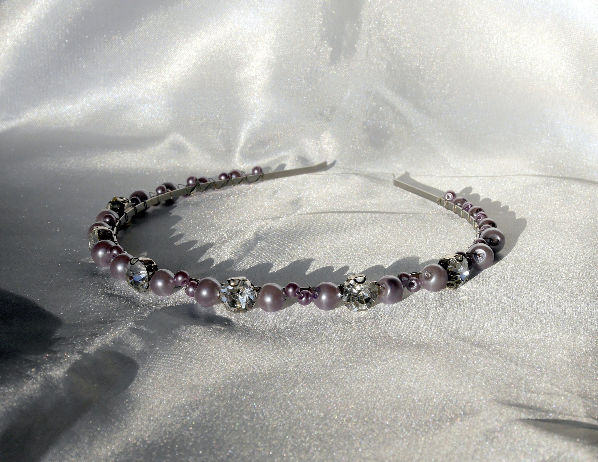 A single silver toned band, delicately wrapped with light Purple (8 mm and 4 mm) faux glass pearls, hand wrapped with silver toned wire. Features 5 diamante glass stones (10 mm) which sit spaced on the band. Please see photos for more details.